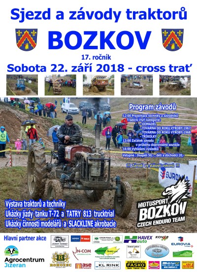 Již 17. ročník sjezdu traktorů se bude konat v sobotu 22. září v Bozkově. Hlavní atrakcí bude závod na crossové trati, ale k vidění budou i ukázky jízdy tanku T-72 a Tatry 813 trucktrial. Kromě prezentace zemědělské a stavební techniky budou probíhat také doprovodné soutěže. Od 12 hodin probíhá prezentace techniky a závodníků, ve 13 hodin je odstartován hlavní závod a v 16 hodin je na programu vyhlášení výsledků. Podrobná pozvánka