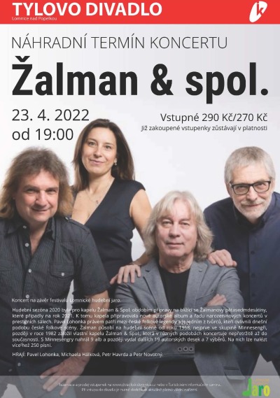 V rámci festivalu Lomnické hudební jaro se v sobotu 23. dubna od 19 hodin koná v Tylově divadle koncert kapely Žalman & spol. Pavel Lohonka právem patří mezi české folkové legendy a je jedním z tvůrců, kteří ovlivnili dnešní podobu české folkové scény. Podrobná pozvánka