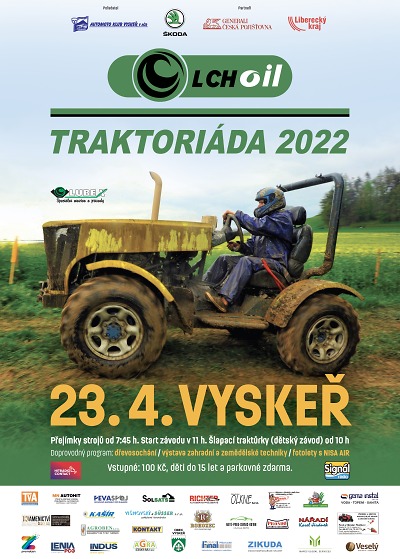 Automoto klub Vyskeř v AČR pořádá v sobotu 23. dubna na ploše místního letiště L.CH. Oil Traktoriádu 2022. Letošní 15. ročník traktoriády podporuje ze svého rozpočtu Liberecký kraj a osobní záštitu udělil Václav Židek člen rady kraje, řízení resortu životního prostředí a zemědělství. Přejímky strojů začínají v 7.45, od 8 hodin se jede jízda zručnosti ‒ slalom a v 11 hodin startuje hlavní závod - dvě jízdy souměrnosti. Závod šlapacích traktůrků pro děti do 9 let se koná od 10 do 12 hodin. Podrobná pozvánka