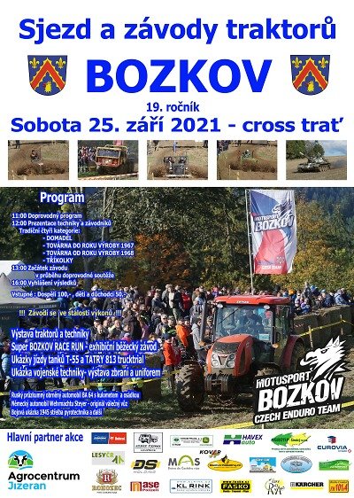 Po dvou letech, když loni došlo ke zrušení kvůli koronaviru, se v Bozkově opět koná sjezd traktorů. Už 19. ročník začne v sobotu 25. září od 11 hodin doprovodným programem, v poledne je v plánu prezentace a hlavní závod traktorů na crossové trati začne ve 13 hodin. Podrobná pozvánka