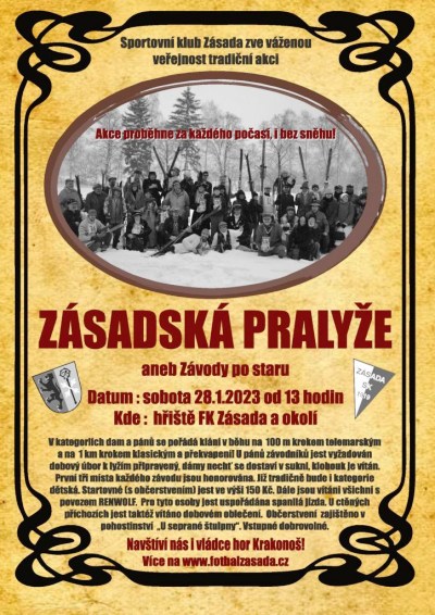 Sportovní klub Zásada zve na tradiční akci Zásadská pralyže aneb závody postaru. Akce proběhne za každého počasí, i bez sněhu v sobotu 28. ledna od 13 hodin na hřišti FK Zásada a v okolí. Účastníky navštíví i vládce hor Krakonoš. Samostatná pozvánka
