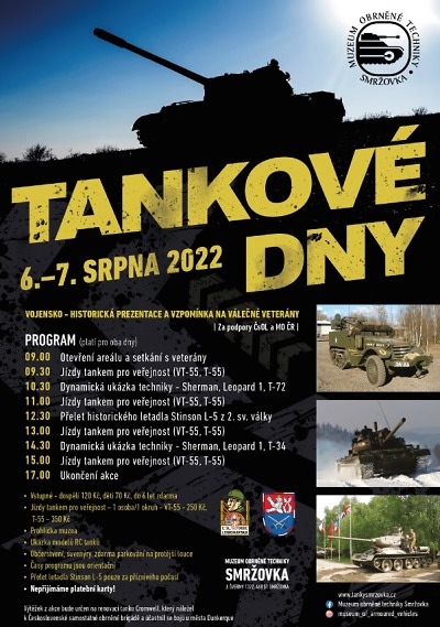 První srpnový víkend (6. -7. 8.) se budou konat tradiční Tankové dny. Nebudou chybět jízdy tankem pro veřejnost (T-55, VT-55, VP-90), ukázky techniky v pohybu (Sherman, Leopard 1, T-72, T-34), přelet historického letadla Stinson L-5 z 2. sv. války, prohlídka muzea, občerstvení a doprovodný program. Podrobná pozvánka