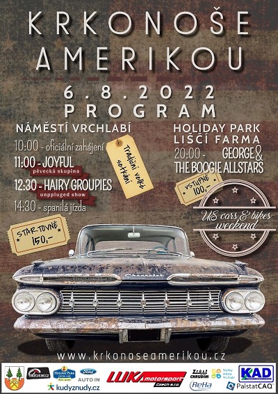 Již sedmý ročník velkého setkání americký křižníků silnic a motocyklů Krkonoše Amerikou bude hostit Vrchlabí a jeho blízké okolí v sobotu 6. srpna. Kulturní program bude pak pro účastníky celého víkendu i v pátek a sobotu večer v Holiday Parku na Liščí farmě. Podrobná pozvánka