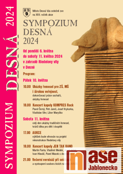 Od pondělí 6. května se opět v zahradě Riedelovy vily rozezní motorové pily a tradiční dřevosochání bude zahájeno, můžete ho navštívit v týdnu od 6. do 11. května. Letošní výtěžek z aukce bude použit na rekonstrukci Riedelovy vily v Desné. Podrobná pozvánka