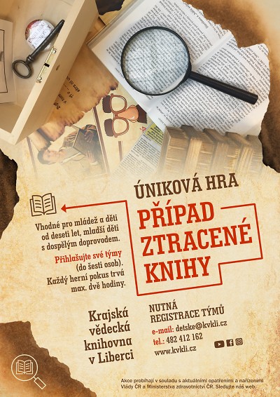 Nově si čtenáři a další dětští i dospělí zájemci mohou přijít do liberecké knihovny zahrát únikovou hru! Tým pracovníků Knihovny pro děti a mládež připravil v prostorách knihovny napínavé a ne zcela triviální pátrání pro všechny generace s názvem Případ ztracené knihy.