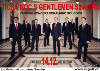 Jedinečný vokální soubor Gentlemen Singers rozdá vánoční náladu v rámci koncertu KPH. V programu Tichá noc s Gentleman Singers zazní skladby od gregoriánského chorálu po úpravy českých lidových písní, populární písně a spirituály a vánoční skladby a koledy z různých koutů světa. V sále KC Golf Semily od 19 hodin. Samostatná pozvánka
