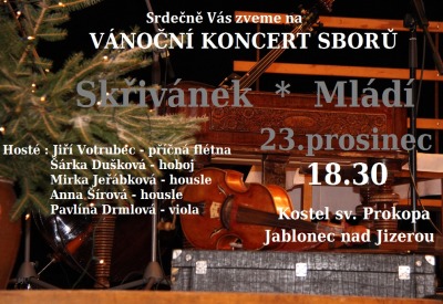 Tento koncert proběhne ve velkém sále zámku v Lomnici nad Popelkou od 19.00. Můžete se svátečně naladit při poslechu koled a vánočních písní v podání domácího souboru pod vedením Petry Lukavcové. Jako vážený host na koncertu vystoupí lomnická rodačka Jana Stehr Prskavcová, vynikající česká sopranistka žijící v Německu.