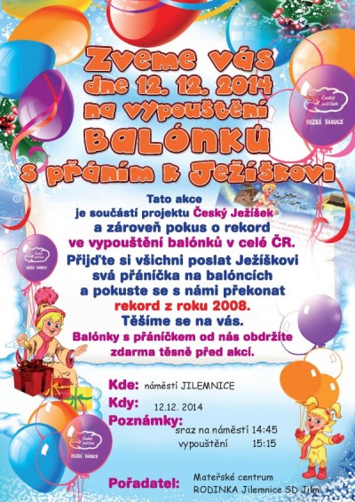 Mateřské centrum Rodinka Jilemnice Vás srdečně zve na vypouštění balónků s přáním k Ježíškovi. Místem konání je Masarykovo náměstí Jilemnice od 15.15. Samostatná pozvánka
