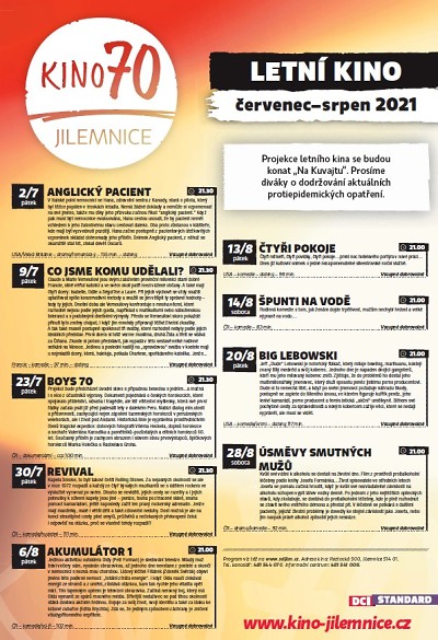 Projekce letního kina v Jilemnici se budou konat opět Na Kuvajtu a nabídnou v červenci a srpnu vždy v pátek a sobotu celkem devět většinou dobře prověřených starších filmů. Pořadatelé prosí diváky o dodržování aktuálních protiepidemických opatření.