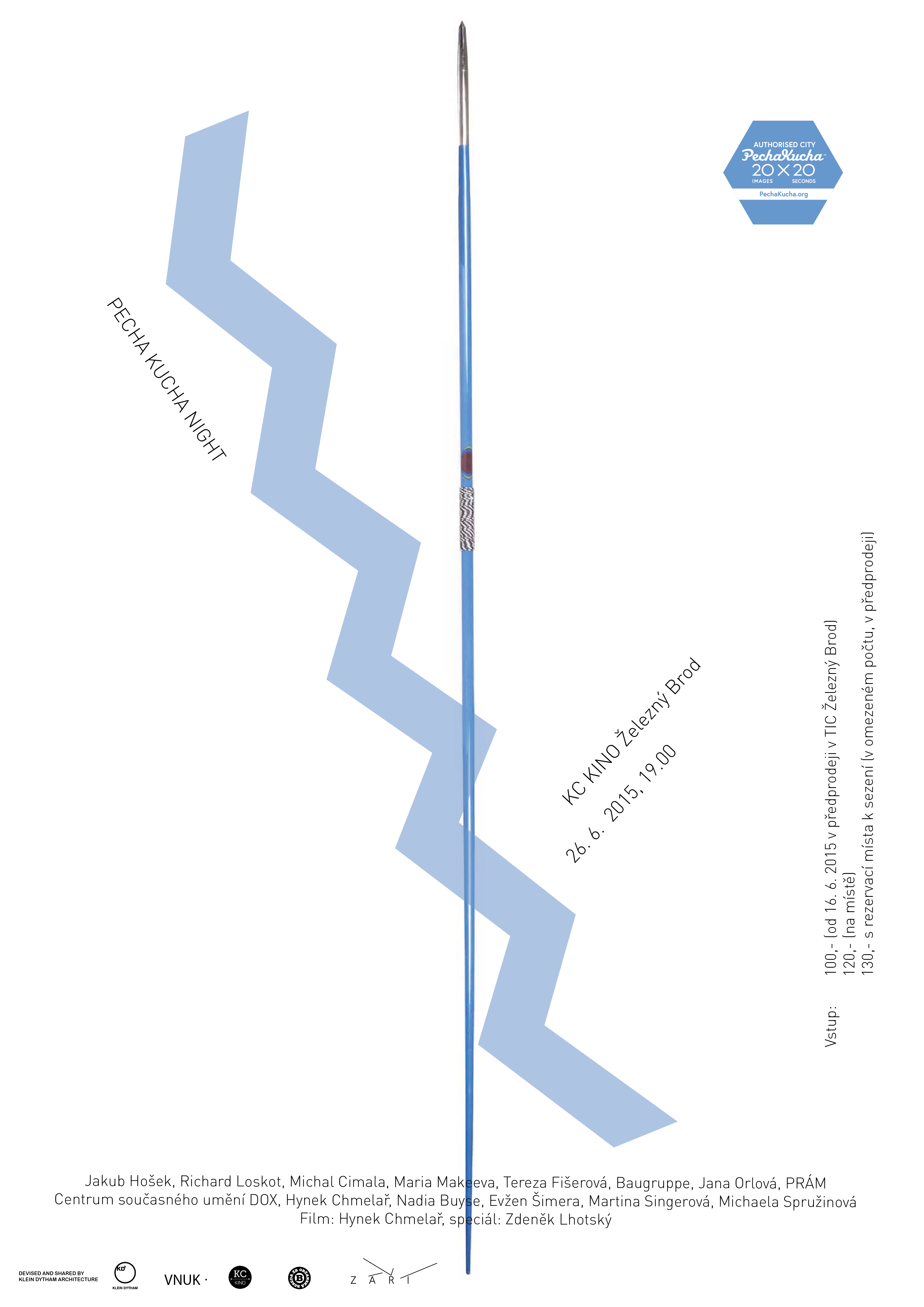 Pecha Kucha Night Železný Brod se koná 26. června 2015 od 19. hodin v KC kino Železný Brod. Vstupenky je možno zakoupit v předprodeji v turistickém informačním centru Železný Brod za 100 Kč, na místě pak za 120 Kč.