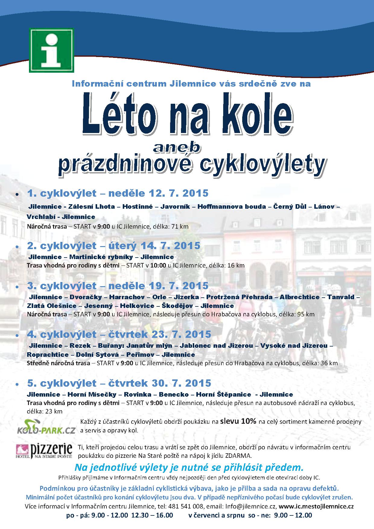 Druhý cyklovýlet následuje už v úterý 14. července a další budou na programu pravidelně každý týden. Ti, kteří projedou celou trasu, získají v jilemnickém infocentru poukázku na nápoj zdarma v místní pizzerii. Podmínkou účasti je přilba a sada na opravu defektů. Na jednotlivé cyklovýlety je nutné se přihlásit v infocentru předem - telefon 481 541 008 nebo email: info@jilemnice.cz.