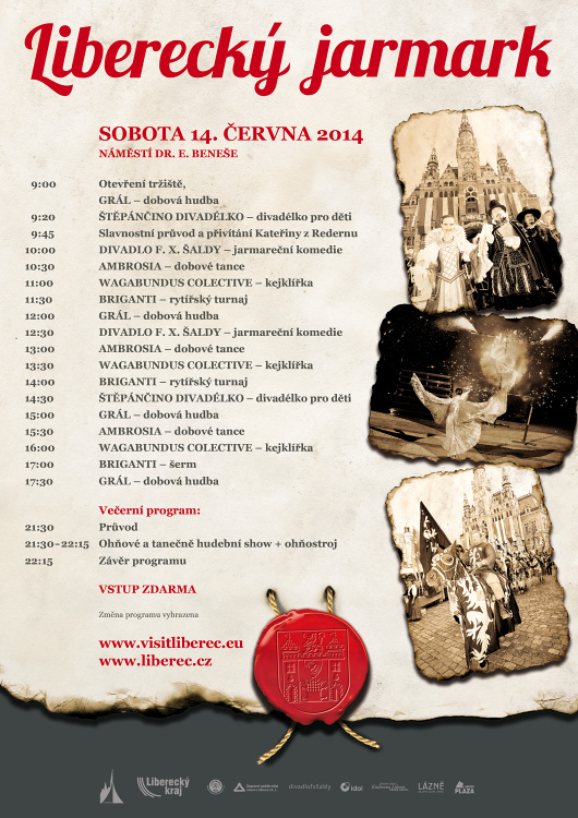 „Liberecký jarmark začne v 9.00 hodin otevřením tržiště. V 9.45 je očekáván příjezd a slavnostní přivítání Kateřiny z Redernu s její družinou. Až do 21.30 hodin, kdy program jarmarku uzavře ohňová a taneční show s ohňostrojem, si lidé užijí sérii vystoupení kejklířů, šermířů, hudebníků a tanečníků," láká náměstek primátorky Liberce Kamil Jan Svoboda.