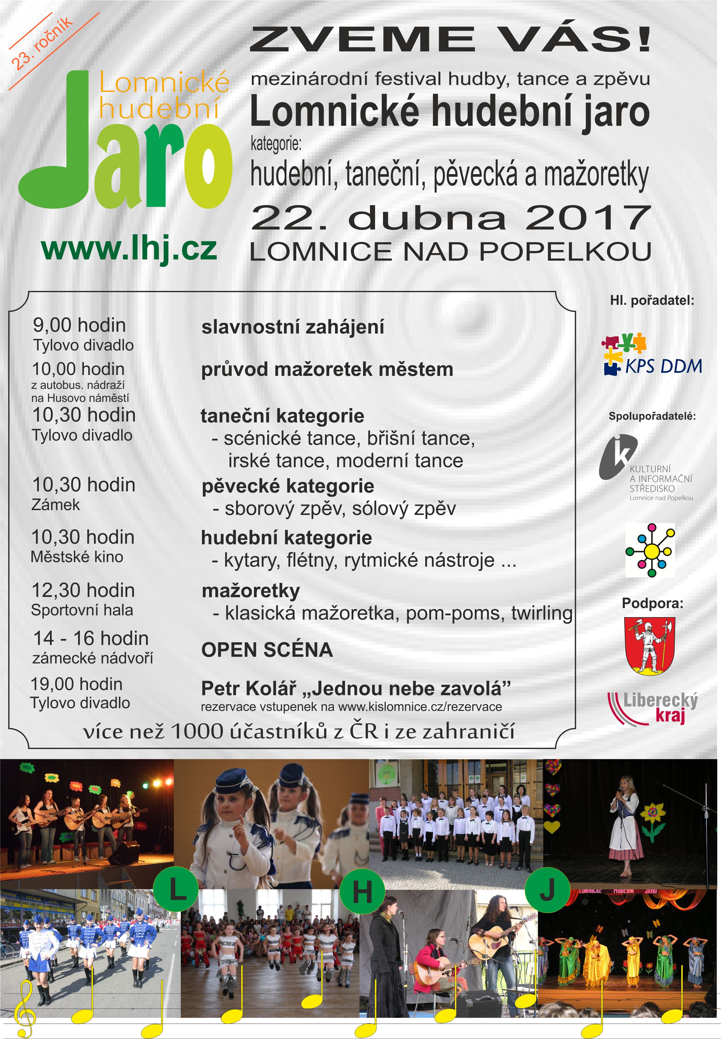 V sobotu 22. dubna se v Lomnici nad Popelkou koná již 23. ročník Mezinárodního festivalu hudby, tance a zpěvu Lomnické hudební jaro 2017, na který každoročně zavítá do města pod horou Tábor tisícovka mladých vystupujících umělců z České republiky i zahraničí.