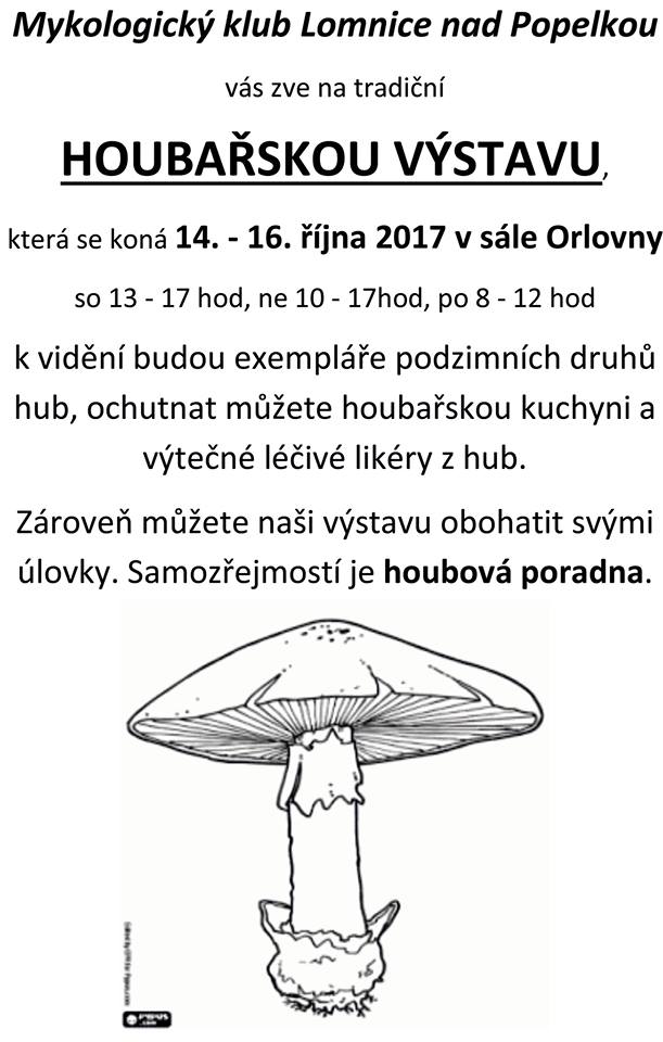 Jako završení úspěšné sezony Mykologický klub z Lomnice nad Popelkou pořádá tradiční výstavu věnovanou houbám. Bude se konat v Orlovně (ulice J. J. Fučíka) o víkendu v termínu 14. a 15. října 2017. V sobotu od 13 do 17 hodin, a v neděli od 10 do 17 hodin. Pondělí 16. října dopoledne bývá věnované školám.