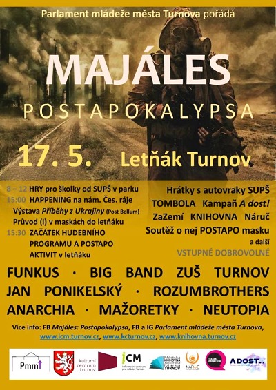 Středa 17. května 2023 patří v Turnově Majálesu! Výstava Příběhy z Ukrajiny, happening na náměstí Českého ráje, masky, koncerty, soutěž o nej postapo masku a spousta dalšího.