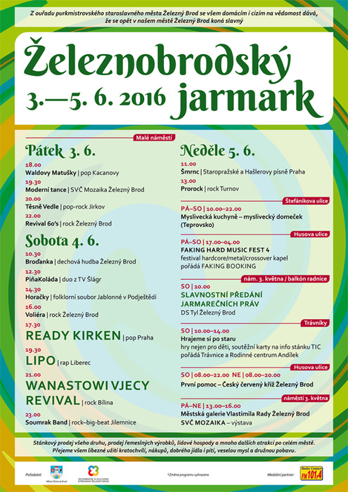 V Železném Brodě o víkendu 3. až 5. června 2016 vypukne tradiční městský jarmark. Vedle kulturního programu na Malém náměstí nebude ani letos chybět Faking Hard Music Fest v Husově ulici.