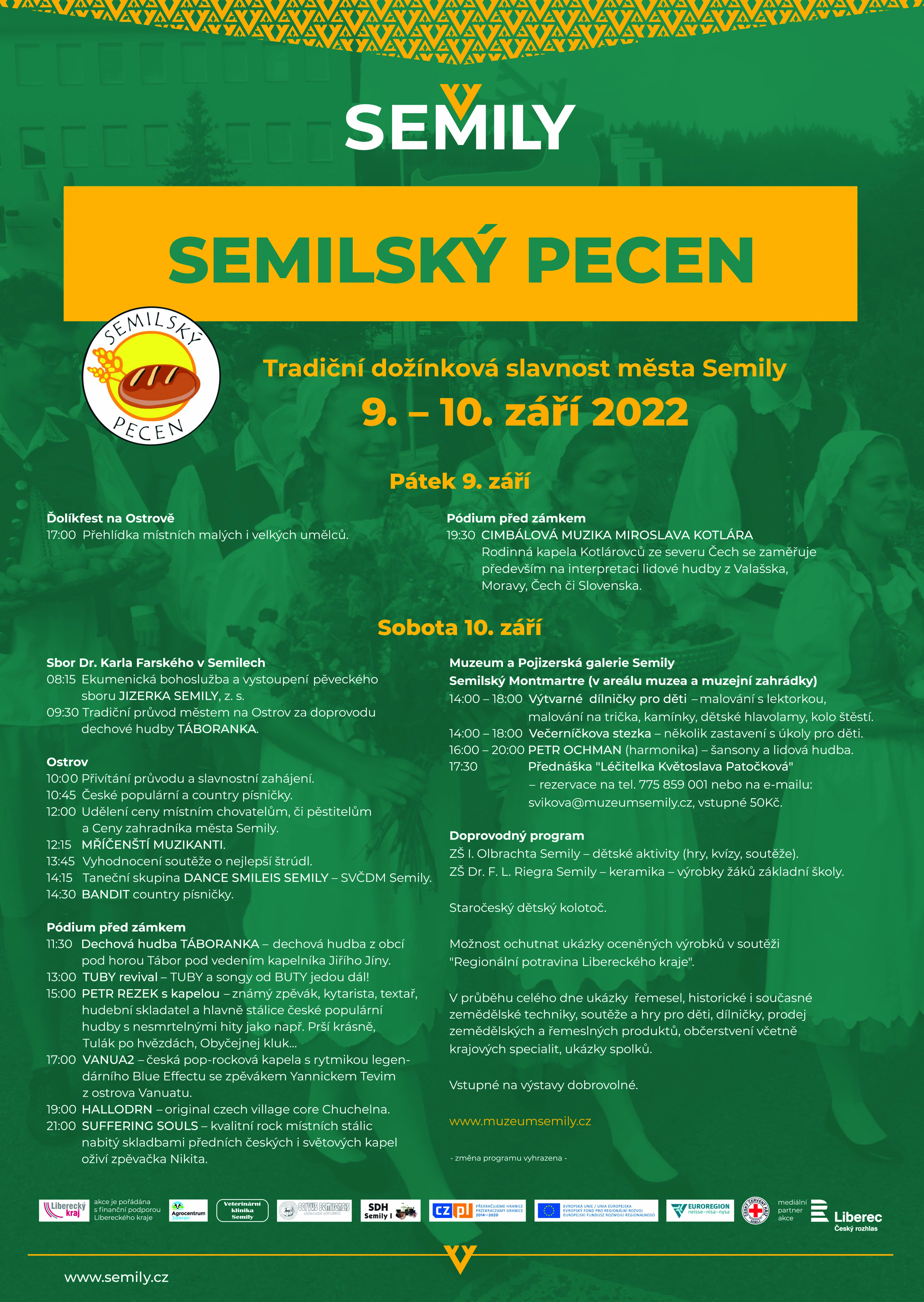 Již poosmnácté se v sobotu 10. září semilským Ostrovem rozvoní tradiční dožínková slavnost Semilský pecen. I tentokrát je pro návštěvníky připraven bohatý program. Nebude v něm chybět dožínkový průvod městem, expozice hospodářských zvířat, ukázky historické i současné zemědělské techniky, rukodělné dílničky i doprovodný kulturní program na Ostrově i na podiu před zámkem.