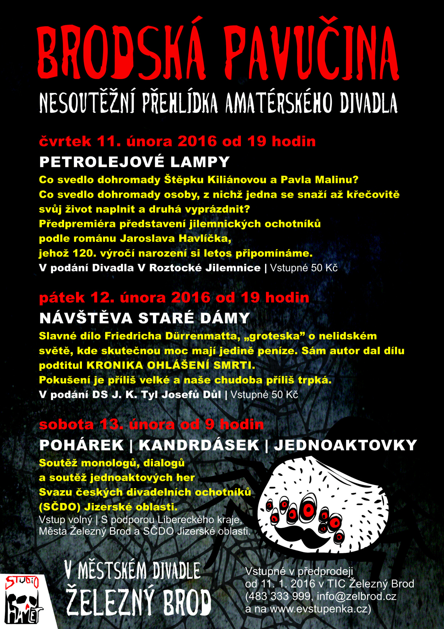 Na únor je v Městském divadle Železný Brod připravena nesoutěžní minipřehlídka amatérského divadla z regionu s názvem Brodská pavučina, která je předvojem soutěžní přehlídky monologů, dialogů a jednoaktovek. Nesoutěžní i soutěžní divadlo.