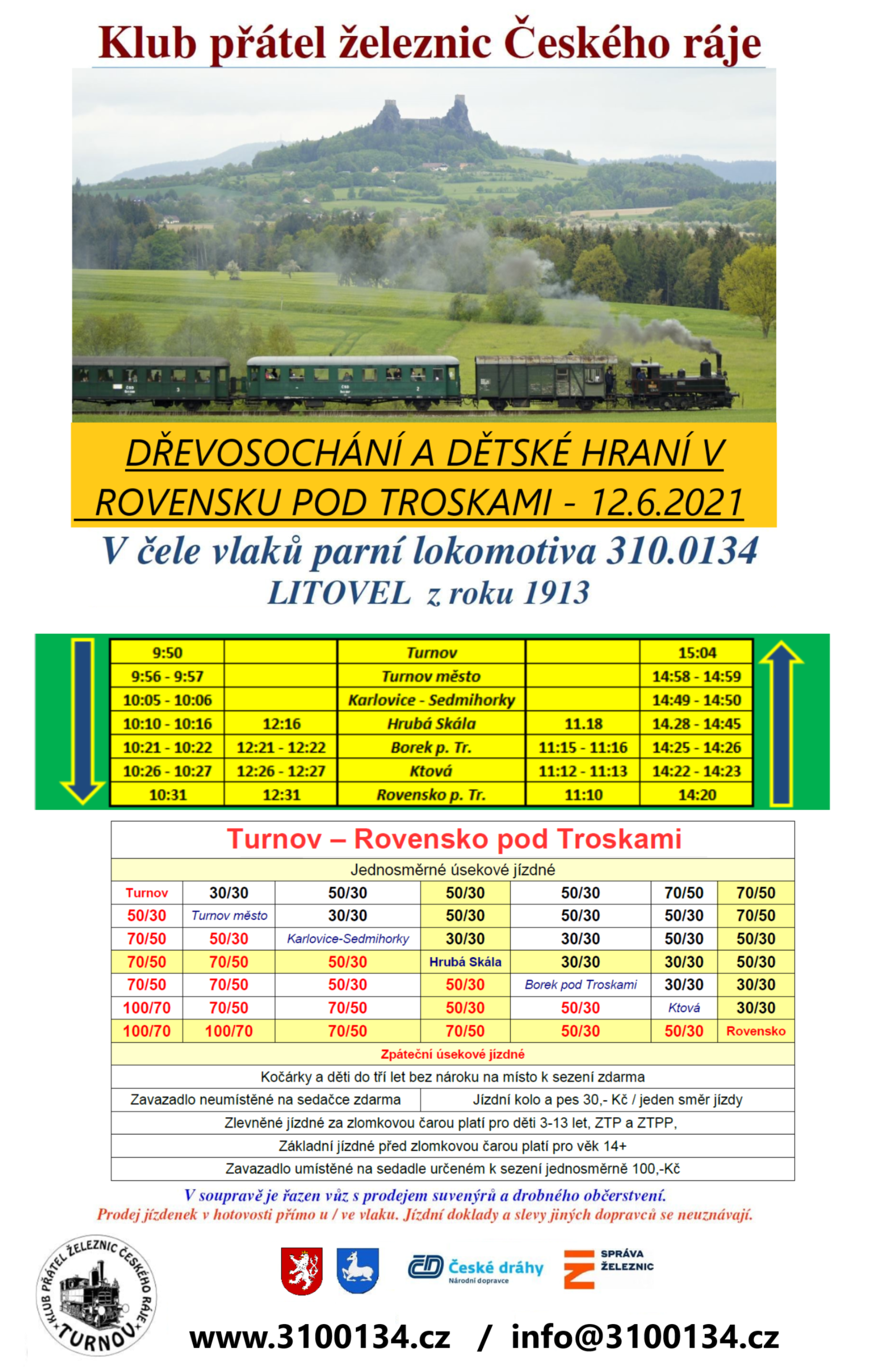 Klub přátel železnic Českého ráje zve na vyjížďku parním vlakem na dřevosochání a dětské hraní v sobotu 12. června do Rovenska pod Troskami. V čele soupravy vlaků pojede parní lokomotiva 310.0134 Litovel z roku 1913.