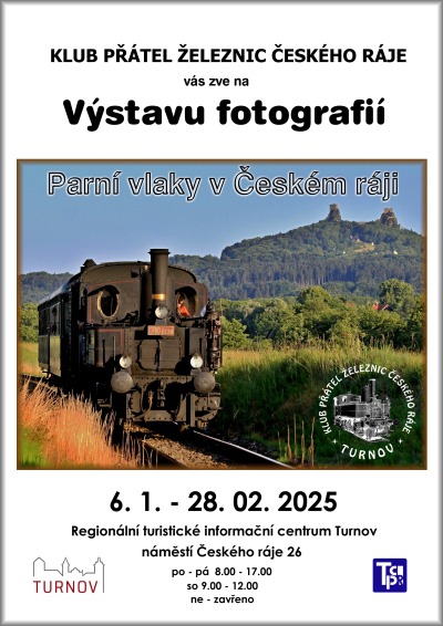 Klub přátel železnic Českého ráje zve na výstavu fotografií Parní vlaky v Českém ráji, která probíhá v Regionálním turistickém centru Turnov na náměstí Českého ráje od 6. ledna do 28. února 2025.