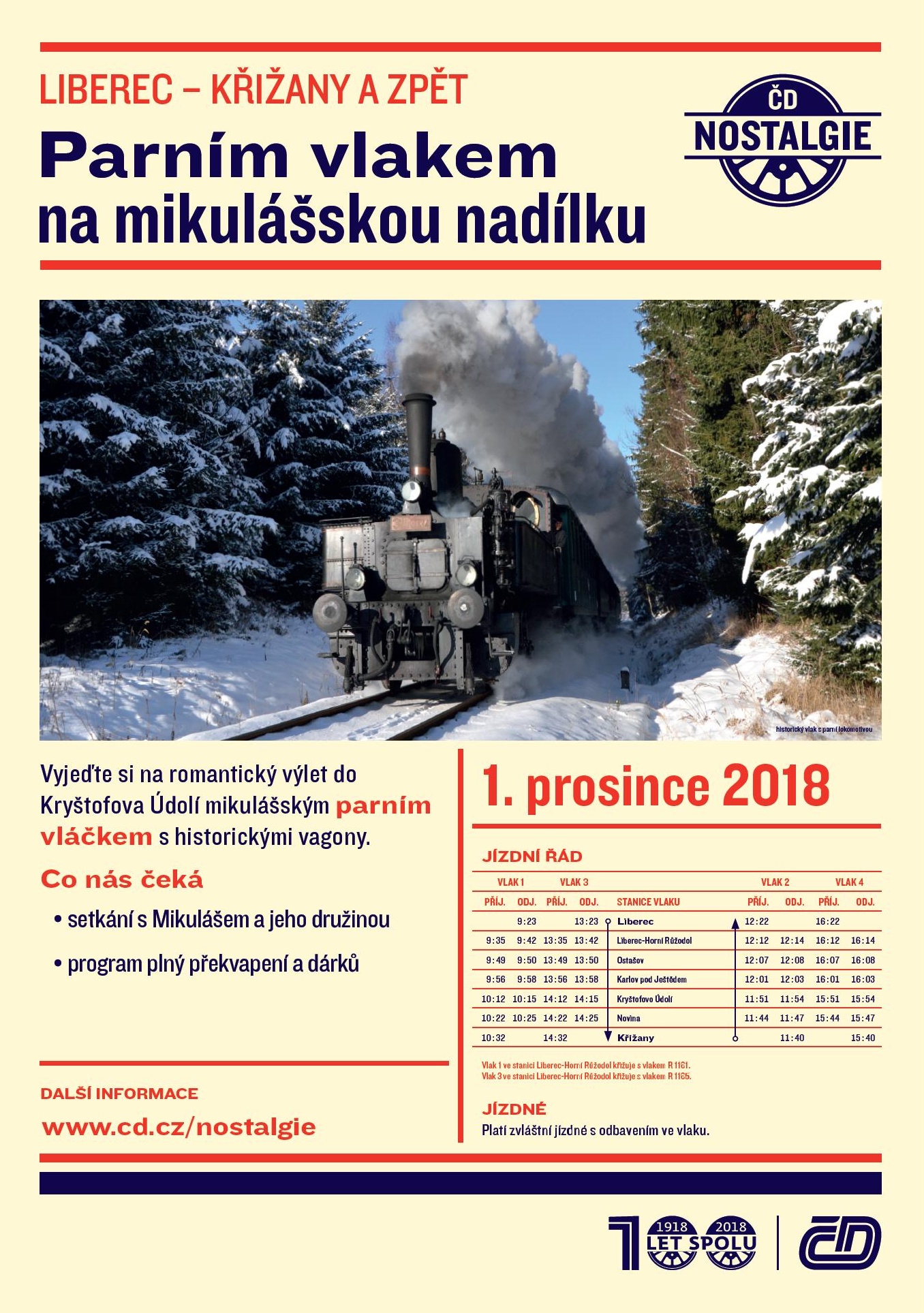První vlak odjíždí z Liberce v 9.23, další ve 13.23 a zpátky z Křižan jede v 11.40 a 15.40. Podrobný jízdní řád najdete na plakátu.