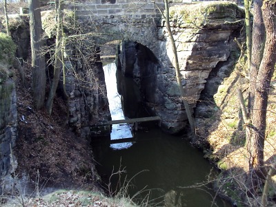 Vpust do dříve několikanásobně většího rybníka zajišťovala hradidla. Přes průrvu po vrcholu skal byl v 18. století vybudován klenutý most, po němž dnes vede silnice I/9 od České Lípy do Doks, případně dále do Prahy přes křižovatku v Jestřebí.