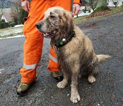 Fotografie zachycuje kynologa HZS Libereckého kraje Pavla Vitáka s jeho psem. Je vidět, že pejsek hledal opravdu důkladně a intenzivně, nicméně seniorku vypátrali jeho kolegové z SDH Hejnice, kterým patří největší dík. Foto: HZS Libereckého kraje