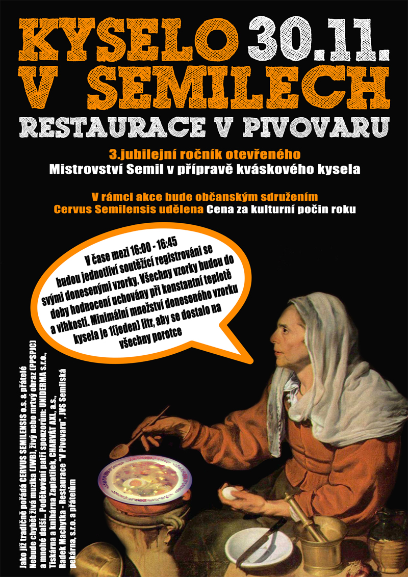 Občanské sdružení Cervus Semilensis a přátelé pořádali v sobotu 30. listopadu 3. ročník Otevřeného mistrovství Semil v přípravě kváskového kysela. Z celkem 14 vzorků osmičlenná porota vyhodnotila jako ten nejlepší Amár Mečířové před druhou Evou Šírovou.