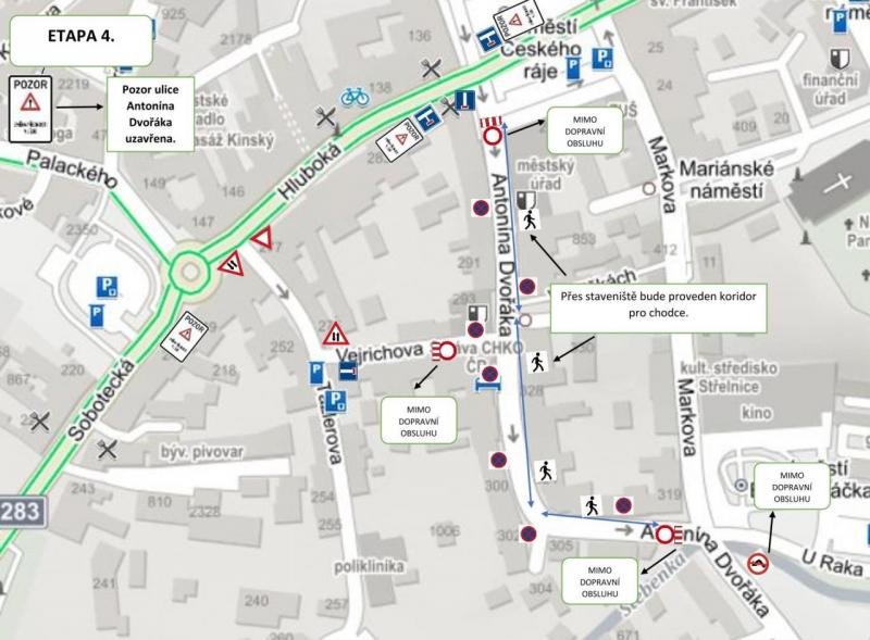 Od náměstí Českého ráje bude instalován zákaz vjezdu, pro obsluhu objektů bude vjezd povolen zcela výjimečně. Pokud to není nezbytně nutné, prosíme, do Dvořákovy ulice nevjíždějte. Pojízdný úsek se bude s postupem výstavby sítí směrem k náměstí zmenšovat. Zhotovitel stavby se pokusí nechat alespoň některé dny provizorně zprůjezdněnu křižovatku s ulicí Vejrichova k nutné obsluze nejbližších objektů.