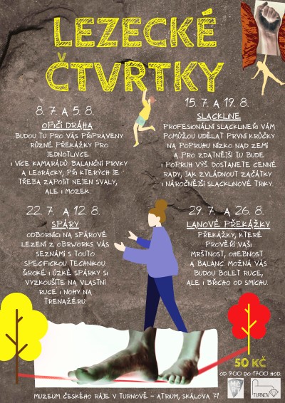 Od 8. 7. do 26. 8. bude každý prázdninový čtvrtek nejen pro děti připraven doprovodný program k expozici Horolezectví - Z Českého ráje na vrcholy světa. Každý si bude moci vyzkoušet doprovodné disciplíny horolezců. Prázdninové lezecké čtvrtky přiblíží pohyb a bytí ve skalách, práci s lanem formou uzlování a další pro horolezce doplňkové pohybové aktivity, jako je například slackline.