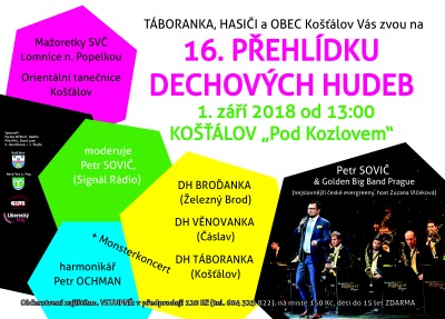 Už 16. ročník Přehlídky dechových hudeb v Košťálově se koná v areálu Pod Kozlovem v Košťálově v sobotu 1. září od 13 hodin. Postupně vystoupí mažoretky a kapely Broďanka, Věnovanka, Táboranka z Košťálova s hostem a Petr Sovič a Golden Big Band Prague, celou akci moderuje Petr Sovič, na závěr zahraje harmonikář Mgr. Petr Ochman.