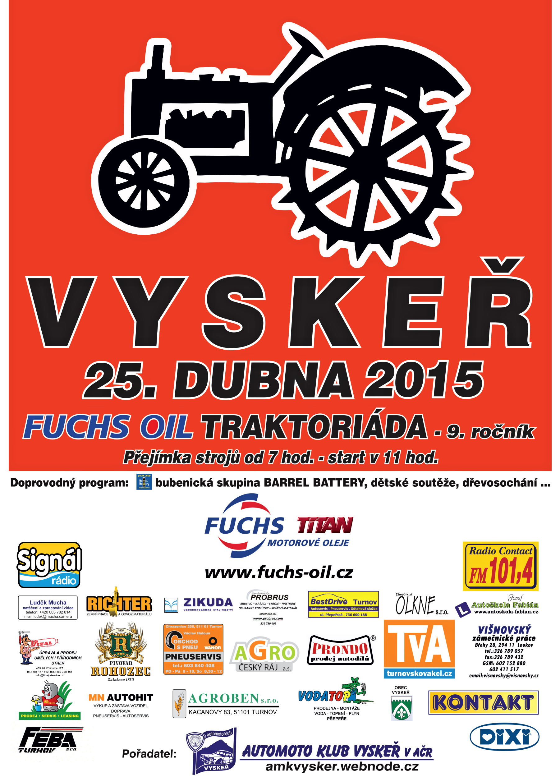 Automoto klub Vyskeř v AČR pořádá v sobotu 25. dubna na nouzové ploše polního letiště 9. ročník Fuchs oil Traktoriády. Ta je vypsána pro dvě kategorie malotraktorů s pohonem jedné a obou náprav a dvě kategorie velkých traktorů - továrních do roku výroby 1970 (veteráni) a od roku 1971 po současnost. Letos je navíc nově vypsána i kategorie ženy.