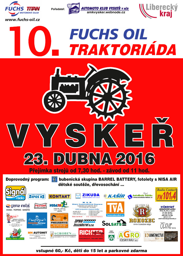 Automoto klub Vyskeř v AČR za podpory Libereckého kraje pořádal v sobotu 23. dubna na ploše polního letiště jubilejní 10. ročník Fuchs Oil Traktoriády. Celkem se účastnilo 50 jezdců, z toho šest žen, které sledovalo 2600 diváků.