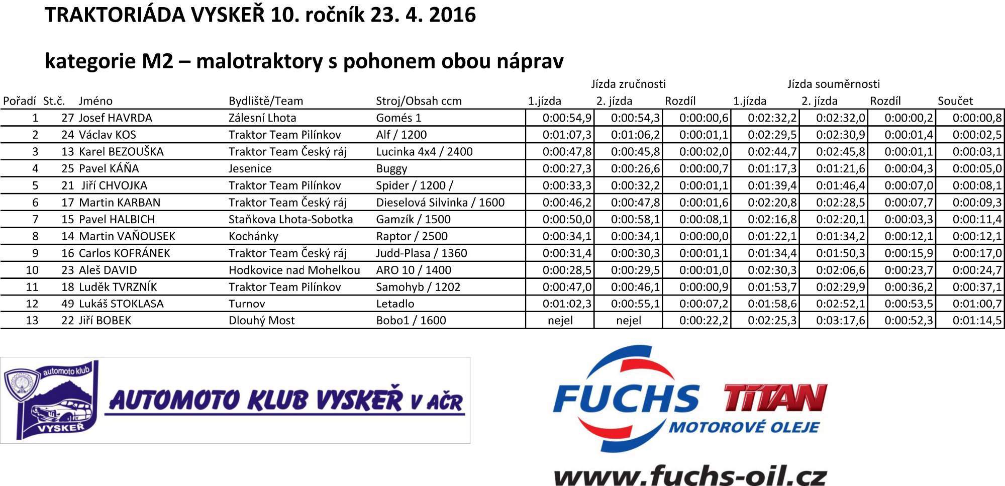 Do pořadí v kategorii M2 (malotraktor domácí výroby s pohonem obou náprav) vyhrál Josef Havrda ze Zálesní Lhoty před Václavem Kosem z Traktor Team Pilínkov a třetím Karlem Bezouškou z Traktor Team Český ráj.