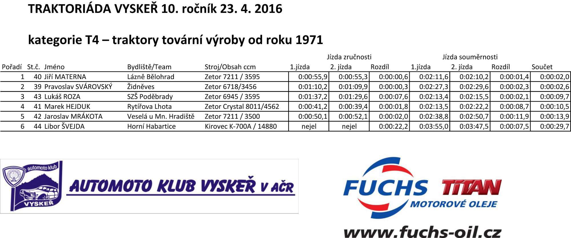 V kategorii T4 (tovární traktory od roku 1971) vylepšil loňské stříbro letos ve zlato Jiří Materna z Lázní Bělohrad, druhý dojel loňský vítěz Pravoslav Svárovský ze Židněvse a třetí byl Lukáš Roza z Poděbrad.