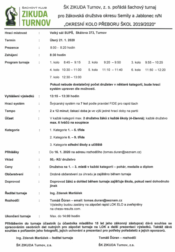 V úterý 21. ledna 2020 proběhl ve velkém sále SUPŠ Turnov šachový turnaj pro žákovská družstva okresu Semily a Jablonec nad Nisou. Zúčastnilo se 15 družstev z devíti základních a středních škol. Soutěžilo se ve dvou kategoriích 1.-5. třída ZŠ a 6.-9. třída ZŠ + střední školy.