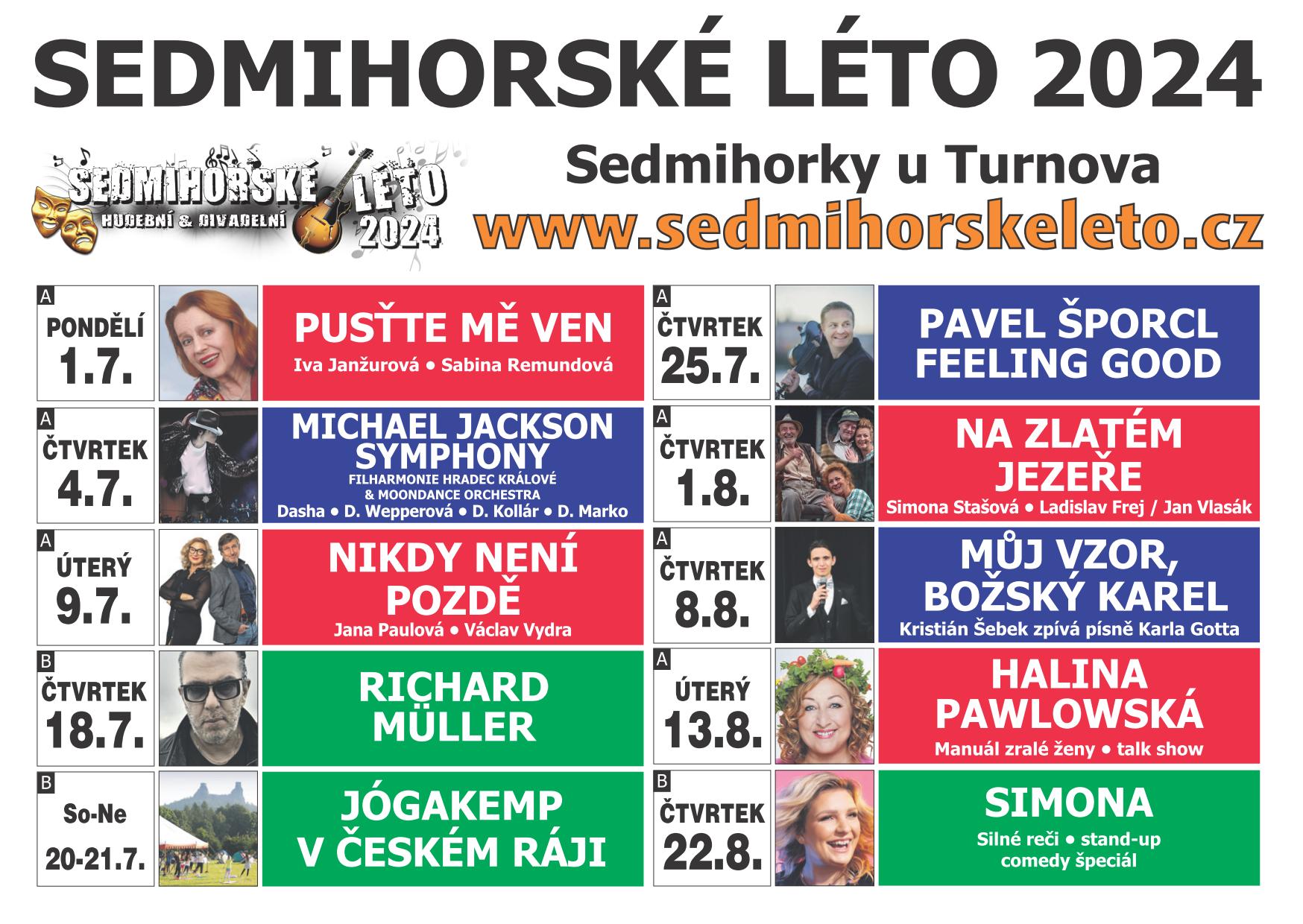 Už tradičně je festival protkán velkými jmény. Letos se poprvé na prknech v Sedmihorkách u Turnova objevila oblíbená Iva Janžurová se svým „jubilejním" představením Pusťte mě ven. Po jejím boku jí sekundovala dcera (a zároveň režisérka představení) Sabina Remnudová. Toto představení Sedmihorské léto 2024 otevřelo v pondělí 1. července. V dalších divadelních představeních pak uvidíte Janu Paulovou, Václava Vydru, Simonu Stašovou, Jiřího Vlasáka, Ladislava Freje. V talk show pak neopakovatelnou Halinu Pawlowskou a hvězdu stand-upů Simonu.