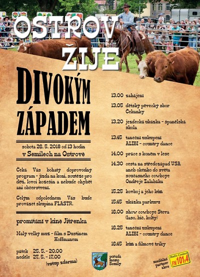 Dřívější akce Westernový den v Semilech se vrací s mírně obměněným názvem Ostrov žije divokým západem a koná se v parku Ostrov v Semilech v sobotu 26. května. Celým odpolednem bude provázet kapela Flastr.