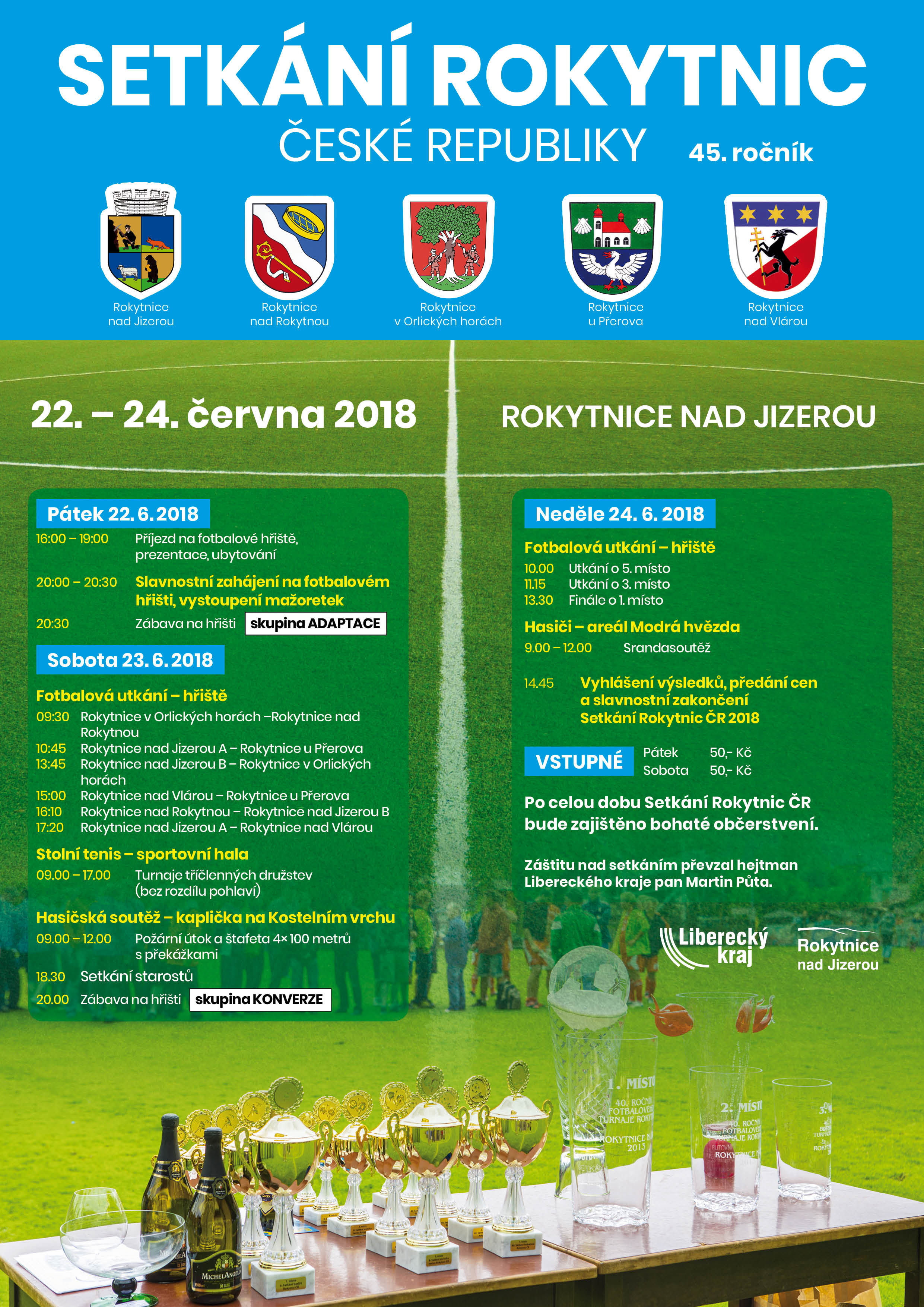V rámci doprovodného programu zahraje v pátek večer kapela Adaptace a v sobotu večer kapela Konverze. Fotbalový turnaj vyvrcholí v neděli ve 13.30 utkáním o celkové vítězství. Záštitu nad Setkáním Rokytnic převzal hejtman Libereckého kraje pan Martin Půta. Bohaté občerstvení je zajištěno.