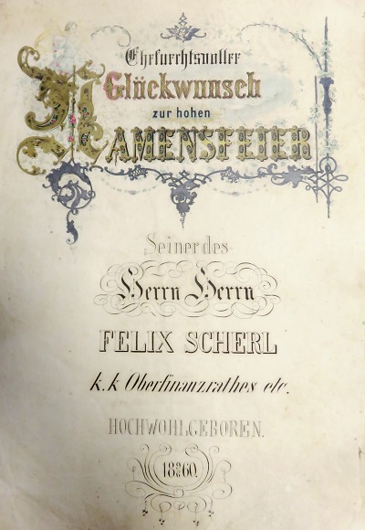 Mile úsměvný náhled do historie nabízí nové exponáty ve sbírkách Severočeského muzea v Liberci. Minulý měsíc do sbírek přibyl soubor šestnácti papírových gratulací z 50. a 60. let 19. století, které věnovali zaměstnanci c. k. finančního ředitelství v Praze svému šéfovi, vrchnímu radovi Felixu Scherlovi (1799-1863) k svátku.