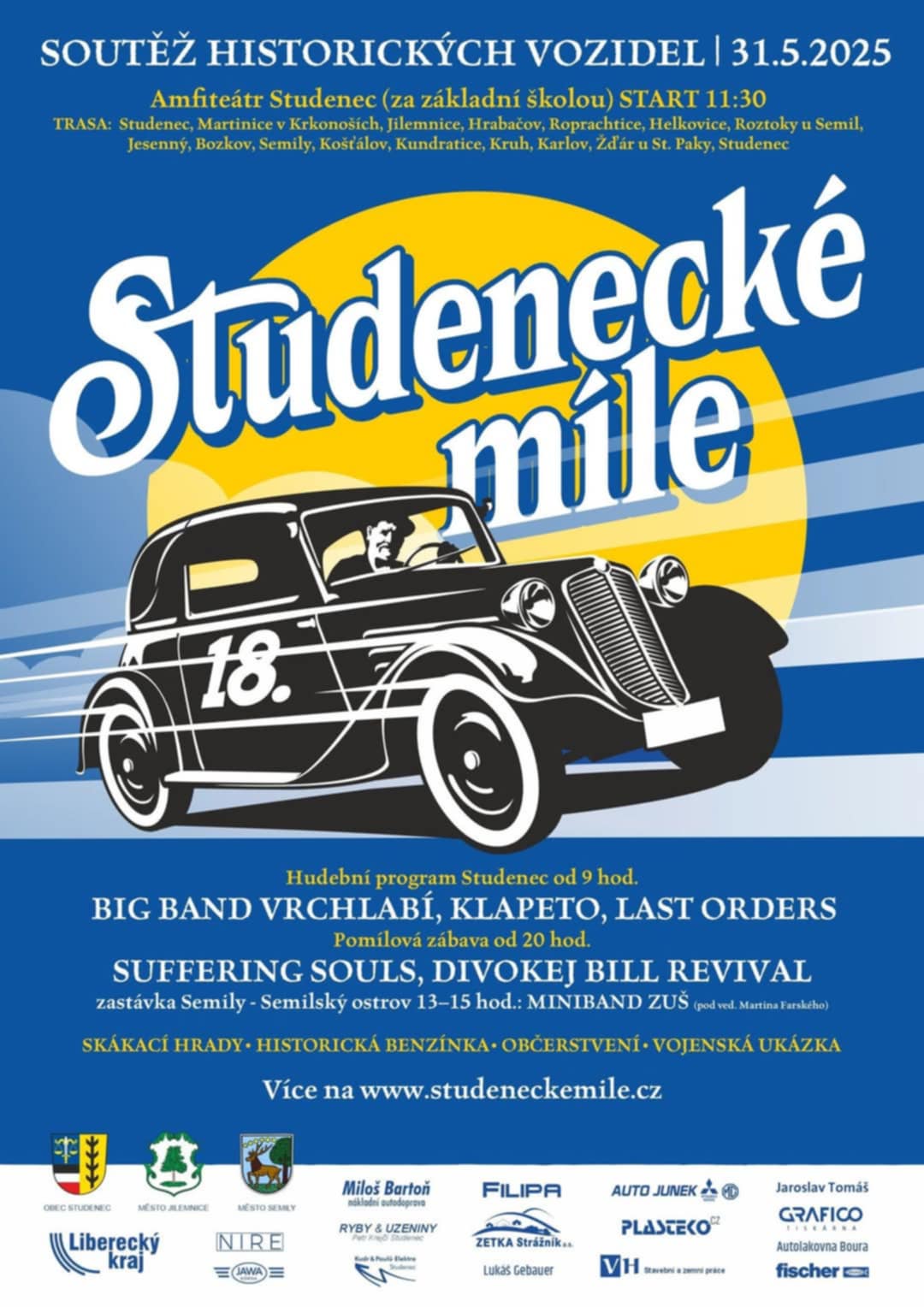 Letošní spanilá jízda pojede v trase Studenec - Jilemnice /oběd/ Vysoké nad Jizerou - Spálov - Železný Brod - Semily - Košťálov - Kruh - Roztoky - Karlov - Studenec. Tradiční Pomílová zábava navnadí k tanečním kreacím od 20 do 2 hodin a vystoupí zde Divokej Bill Revival a Suffering Souls.