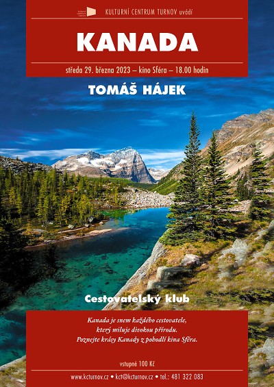 Změna v programu - o Kanadě bude vyprávět Tomáš Hájek. Původním přednášejícím měl být Václav Bacovský. Cestovatelský klub, kino Sféra Turnov středa 29. března od 18 hodin, vstupné 100 Kč.