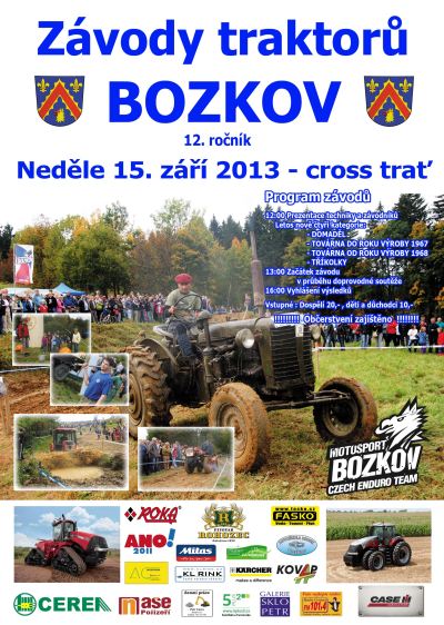 Již 12. ročník sjezdu traktorů se uskuteční v neděli 15. září v Bozkově. Kromě crossového závodu traktorů ve čtyřech kategoriích jsou opět součástí i doprovodné soutěže jako jízda s trakařem, házení bramborou, koulení pneumatik a nebo hod vidlemi.