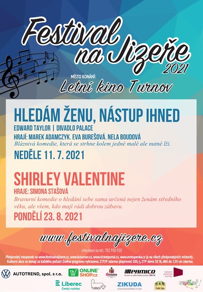 Festival na Jizeře, letní kino Turnov od 19.30 hodin, vstupné v předprodeji 490/ na místě 550 Kč. Samostatná pozvánka