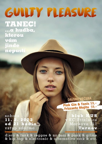 Taneční večírek Guilty Pleasure je určen všem, kdo si chtějí trsnout, ale nikdo jim nehraje tu jejich hudbu. Nečekejte žádný jukebox s písničkami na přání, ale vyladěný playlist, který pohladí po duši a rozvlní vaše boky. Zkrátka večer plný hudby, kterou jinde neuslyšíte. Akční drinky: Pink Gin + Tonic 59 Kč/ Frizzante Mojito 59 Kč.