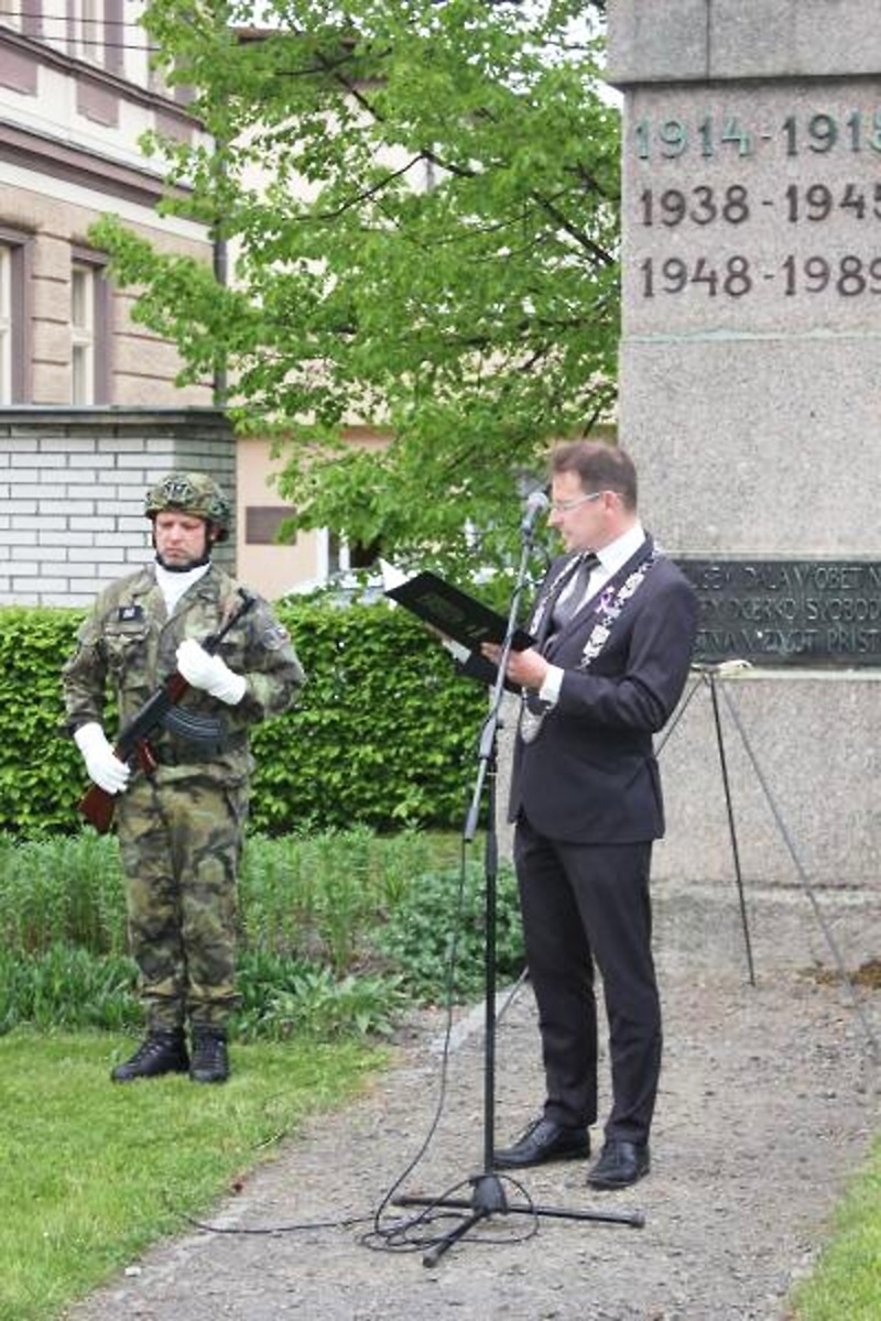 Odpoledne bylo završeno u pomníku padlých ve Skálově ulici, kde proběhla připomínka Dne vítězství s kladením květin a věnců. Starosta města Tomáš Hocke ve svém projevu připomněl 77. výročí vítězství protifašistické koalice a ukončení 2. světové války v paralele se současnou situací na Ukrajině, kdy uprchlická vlna může připomínat osud řady Čechů, kteří kdysi před válkou prchali na západ.