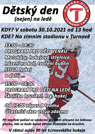 Součástí oslav 90 let hokeje v Turnově je i dětský den, který se bude konat v sobotu 30. října od 13 hodin. Kromě zábavy na ledě budou děti moci využít motokáry, házení na koš, tvoření bublin nebo Stiga hokej.