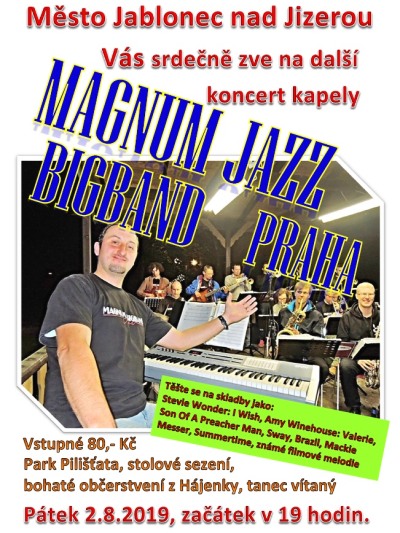 Město Jablonec nad Jizerou zve na další koncert kapely Magnum Jazz Bigband Praha. Zazní skladby Stevieho Wondera, Amy Winehouse i známé filmové melodie. Koná se v parku Pilišťata při bohatém občerstvení z Hájenky v pátek 2. srpna od 19 hodin.