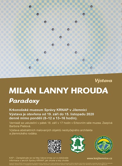 V Krkonošském muzeu v Jilemnici chystají vernisáž výstavy Milan Lanny Hrouda, Paradoxy. Jedná se o výstavu abstraktních malovaných objektů neobyčejného architekta a jilemnického rodáka. Vernisáž se uskuteční v pátek 18. září 2020 v 17 hodin v Erbovním sále muzea. Zazpívá Barbora Piešová. Výstavu budete moci navštívit do 15. listopadu 2020.