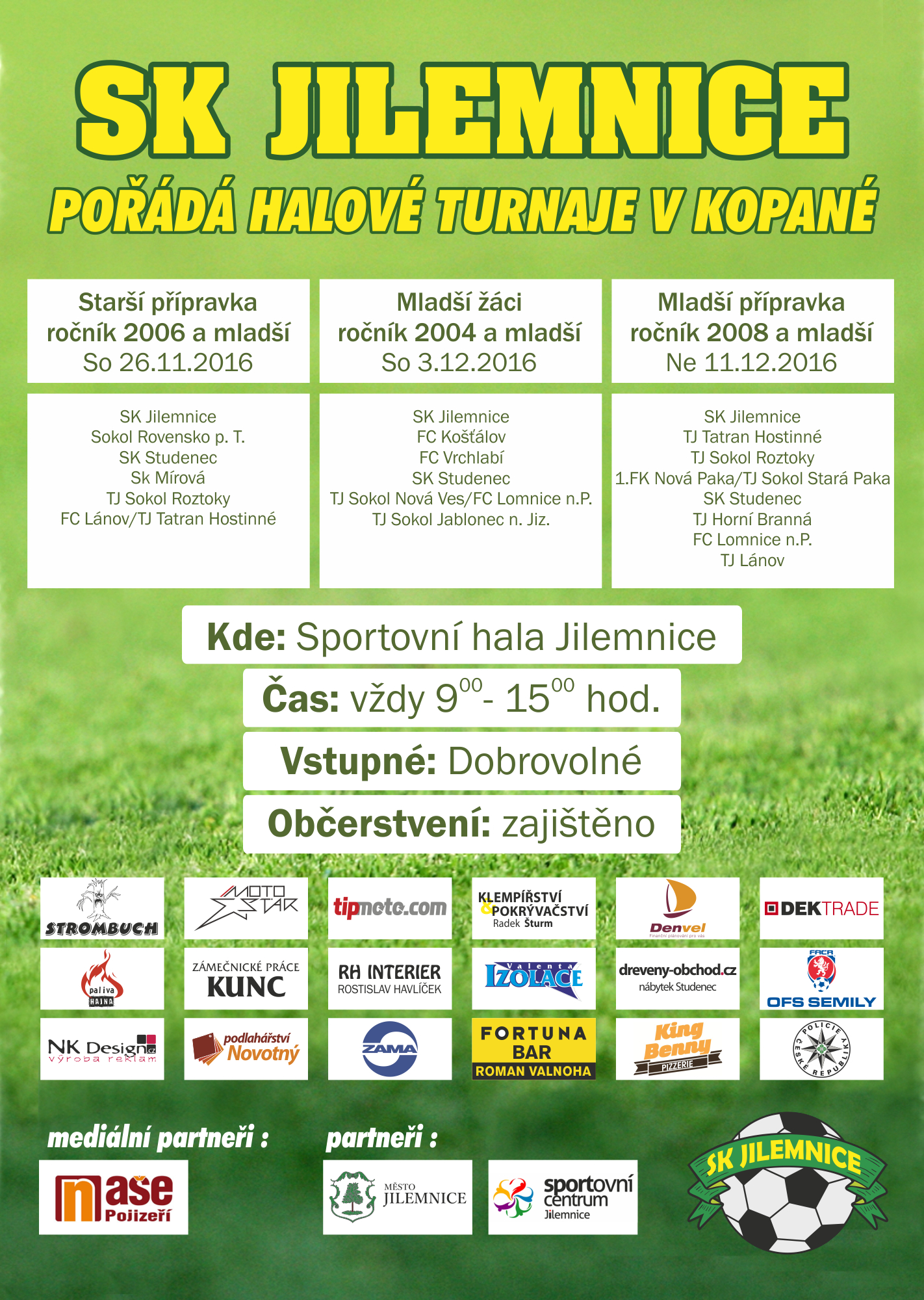 První z trojice mládežnických turnajů v halové kopané se koná již v sobotu 26. listopadu ve Sportovním centru Jilemnice, kdy se utkají družstva starších přípravek. Po nich následují v sobotu 3. prosince mladší žáci a v neděli 11. prosince mladší přípravky.